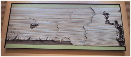 正面玄関から入るとゆったりとしたクラシック音楽が流れていて、高級ホテルと思わせるような空間が広がります。そして、奥に目を向けると、あの有名な高山市出身で左官職人の挾土秀平さんの「岐阜に舞う」という壁画が目に飛び込んできます。その壁画は、幅約10m、高さは約4mの大作で挾土さんの最大級の作品です。飛騨の祭り屋台の紙吹雪と美濃の鵜飼いのかがり火の「火の粉」が、岐阜県に舞うさまを大胆にかつ繊細に表現した絵巻物に仕上げてあります。歴史を引き継ぎながら岐阜県が発展するように挾土さんが願いを込めて制作されたそうです。作品全体に櫛引きの技法を施し段差を付けることにより陰影が生じ、高度な技法により、平面でありながら立体的に見えます。一度鑑賞したいと思っていた挾土さんの作品を、間近に見ることができ感激していまいました。