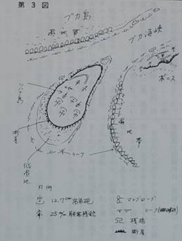 第三図にソハナ島の対空砲台を図示して置きました。なお高角砲と申しますのは軍艦に据え付ける対空砲でこれを陸上に砲台を作って据え付けたもので移動できません。高射砲と申しますのは陸軍が使用していた砲車による移動可能なもので、高角砲と高射砲ではそのような違いがございます。念の為。 第一図にブカ地区の飛行場の所在と地吊を書いておきました。ブカ海峡を挟んでブカ島側が第一飛行場、ボニス側第二飛行場、ツアパイの第三飛行場、ツアパイの第三飛行場は未完でした。ポートン海岸は昭和二十年六月、敵が上陸して我が方に撃退された地点で、この海岸だけが砂浜で、上陸可能地であり(その他の地域はマングローブ樹密生)、この一帯は陣地と思われる地点、海岸の地雷布設可能地域は同年四月以降、徹底的に攻撃されました。
