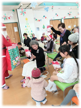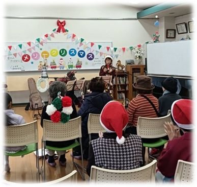 アミさんのミニコンサートで盛り上がり、サンタさんからのプレゼントをもらって笑顔いっぱい。