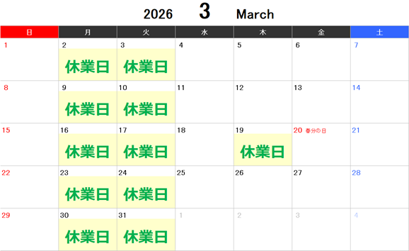 通常の月・火以外に3月19日(木)が都合により休業となります。